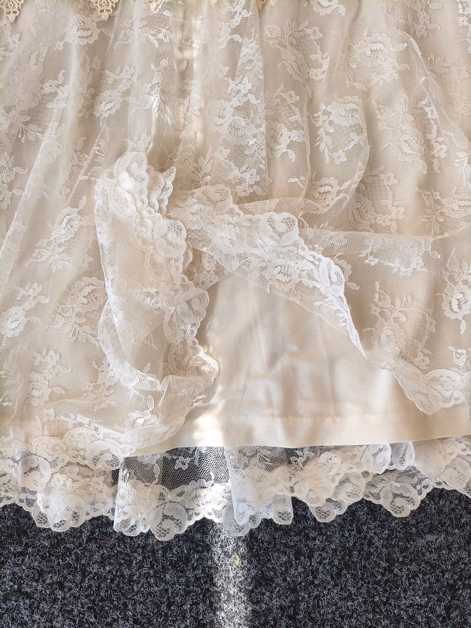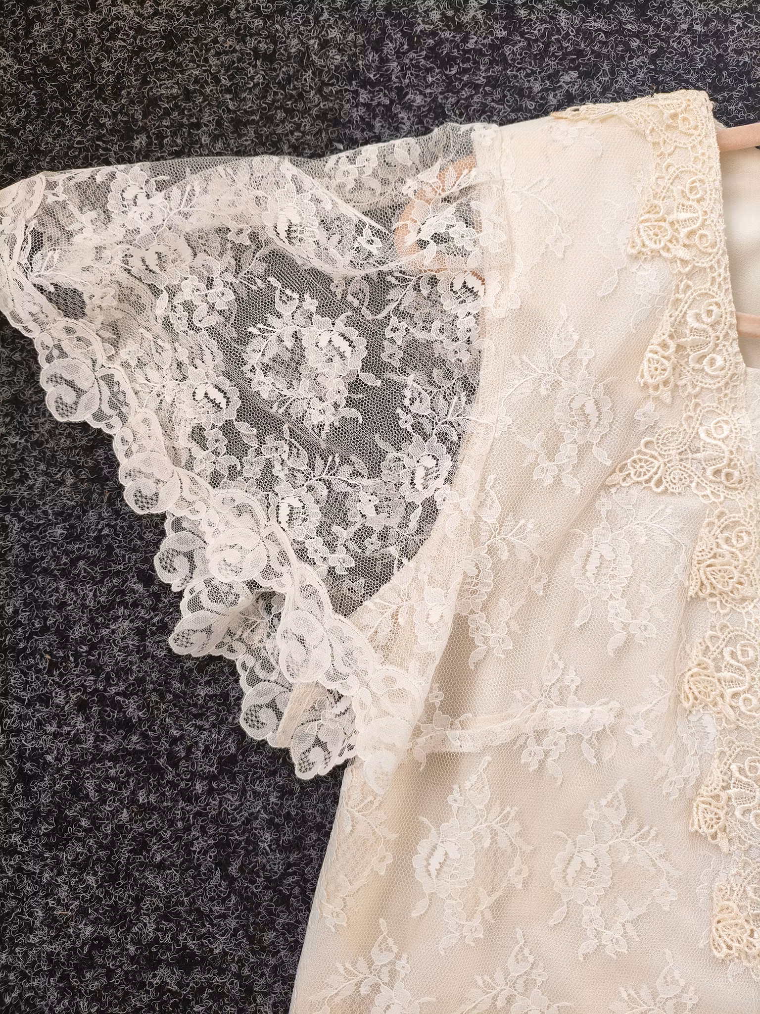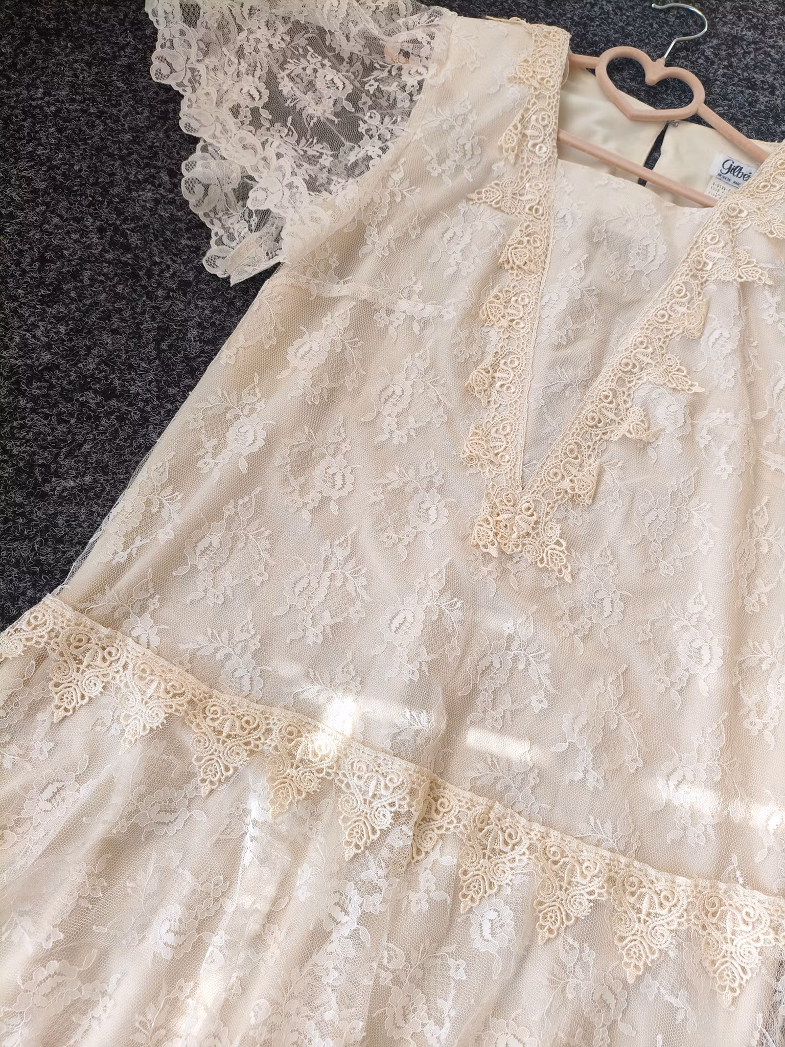 Creméfärgad vintageklänning från Gilbérti i skirt spetstyg och otroligt vackra detaljer, fodrad kropp och skira flowiga ärmar. Lätta axelvaddar (som enkelt kan tas bort).