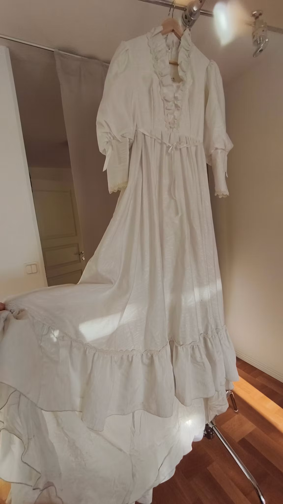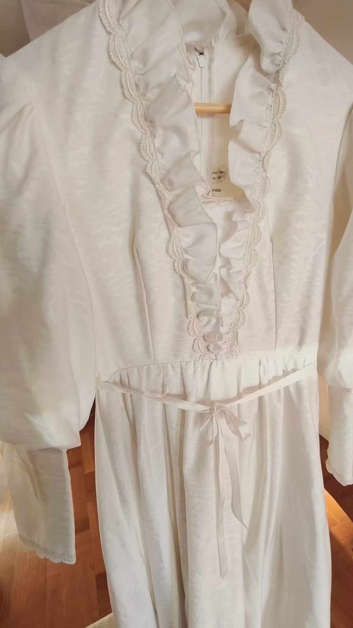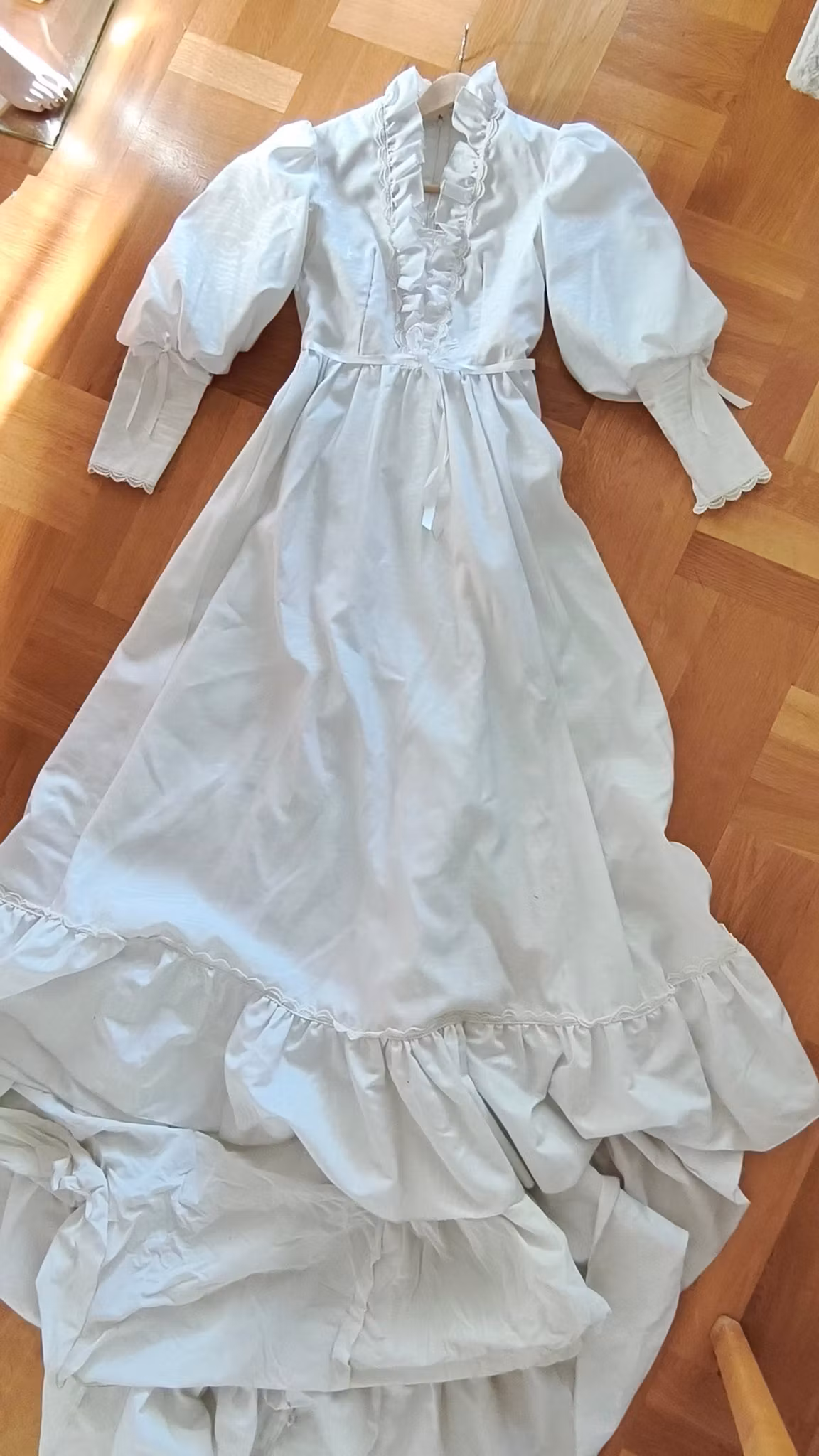 Vit klänning i viktoriansk stil med puffärmar, krås, spetsdetaljer, underkjol, dragkedja bak, fodrad, med underkjol och rejält långt kjoltyg bak. Klänningen har använts och levt loppan och har således flera fläckar längst ned samt lätt smutsig långt ned på kjolen som släpat i marken, se exempel på sista fotona.