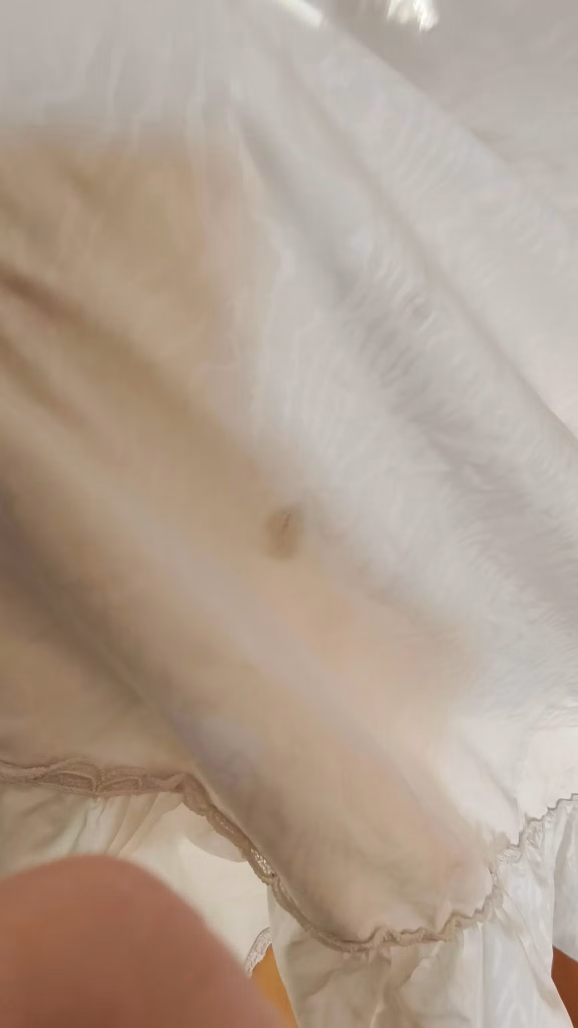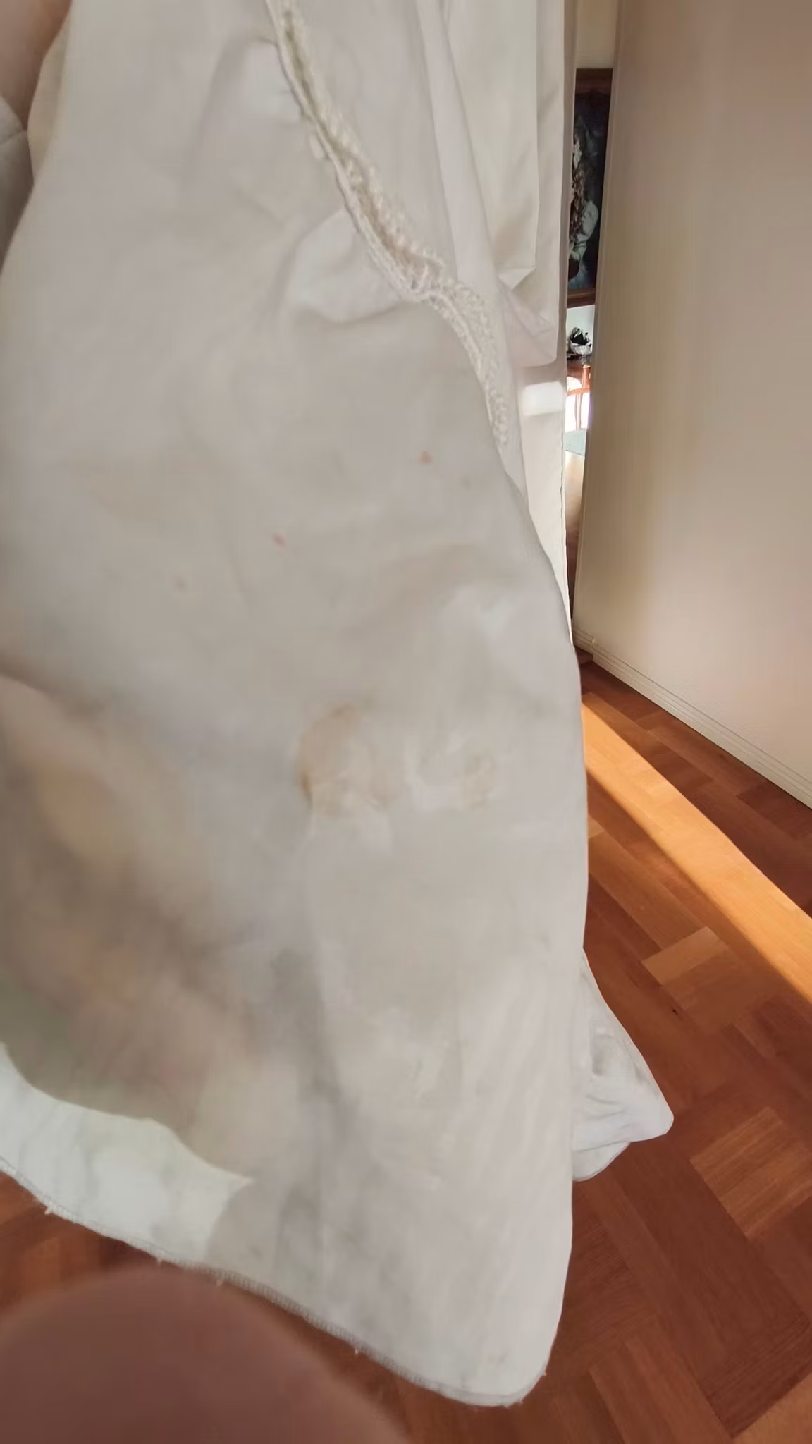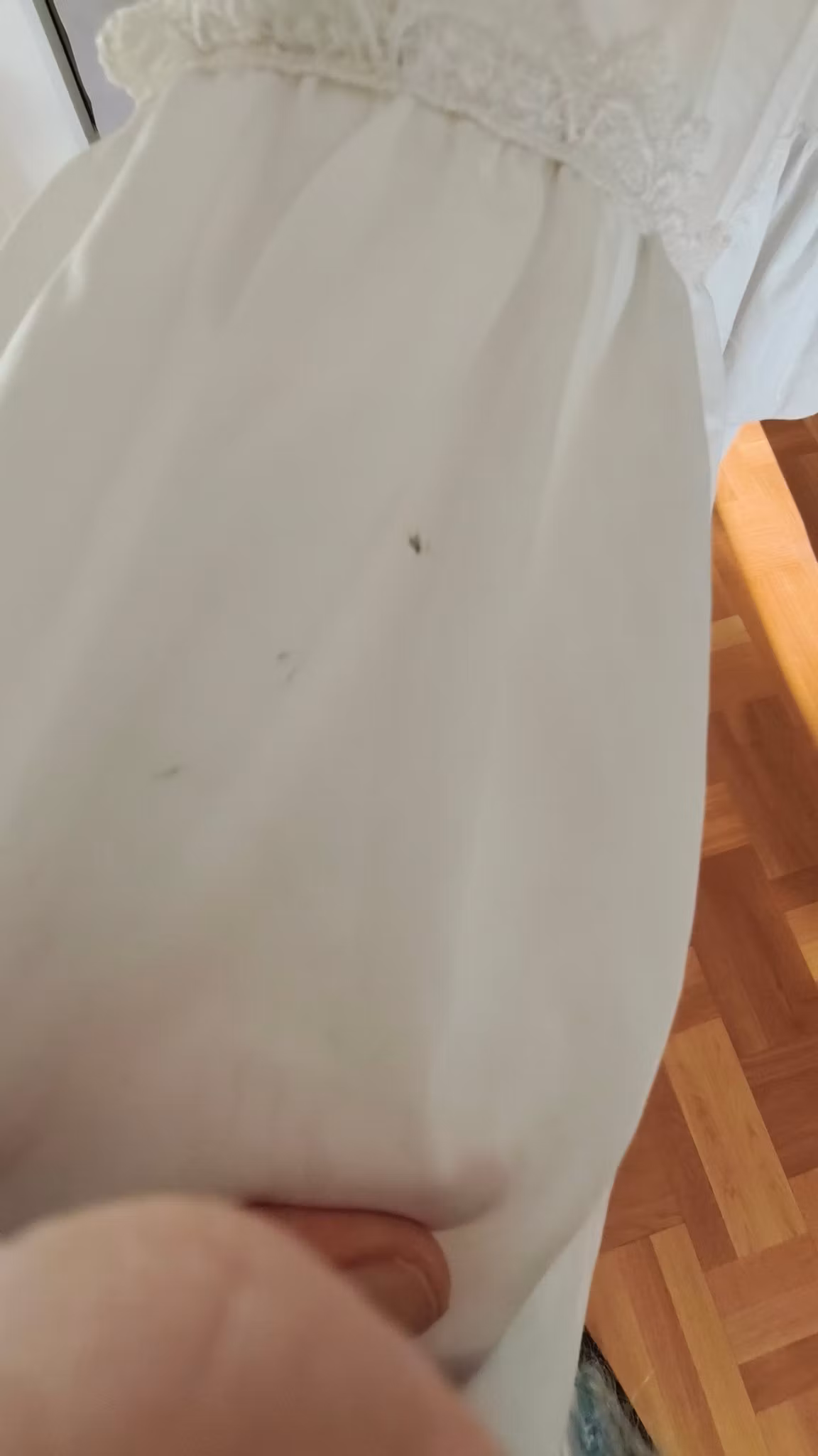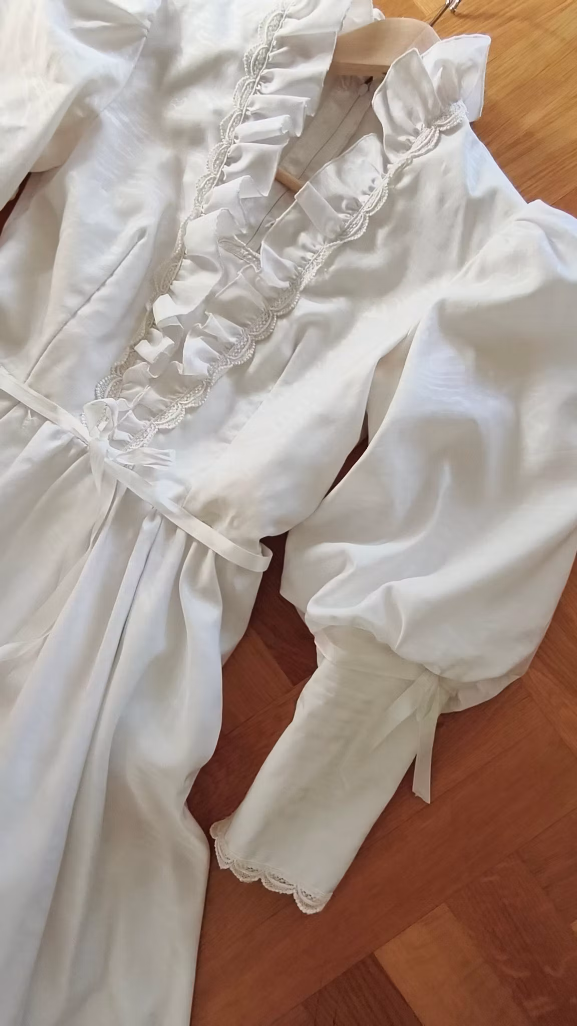 Vit klänning i viktoriansk stil med puffärmar, krås, spetsdetaljer, underkjol, dragkedja bak, fodrad, med underkjol och rejält långt kjoltyg bak. Klänningen har använts och levt loppan och har således flera fläckar längst ned samt lätt smutsig långt ned på kjolen som släpat i marken, se exempel på sista fotona.