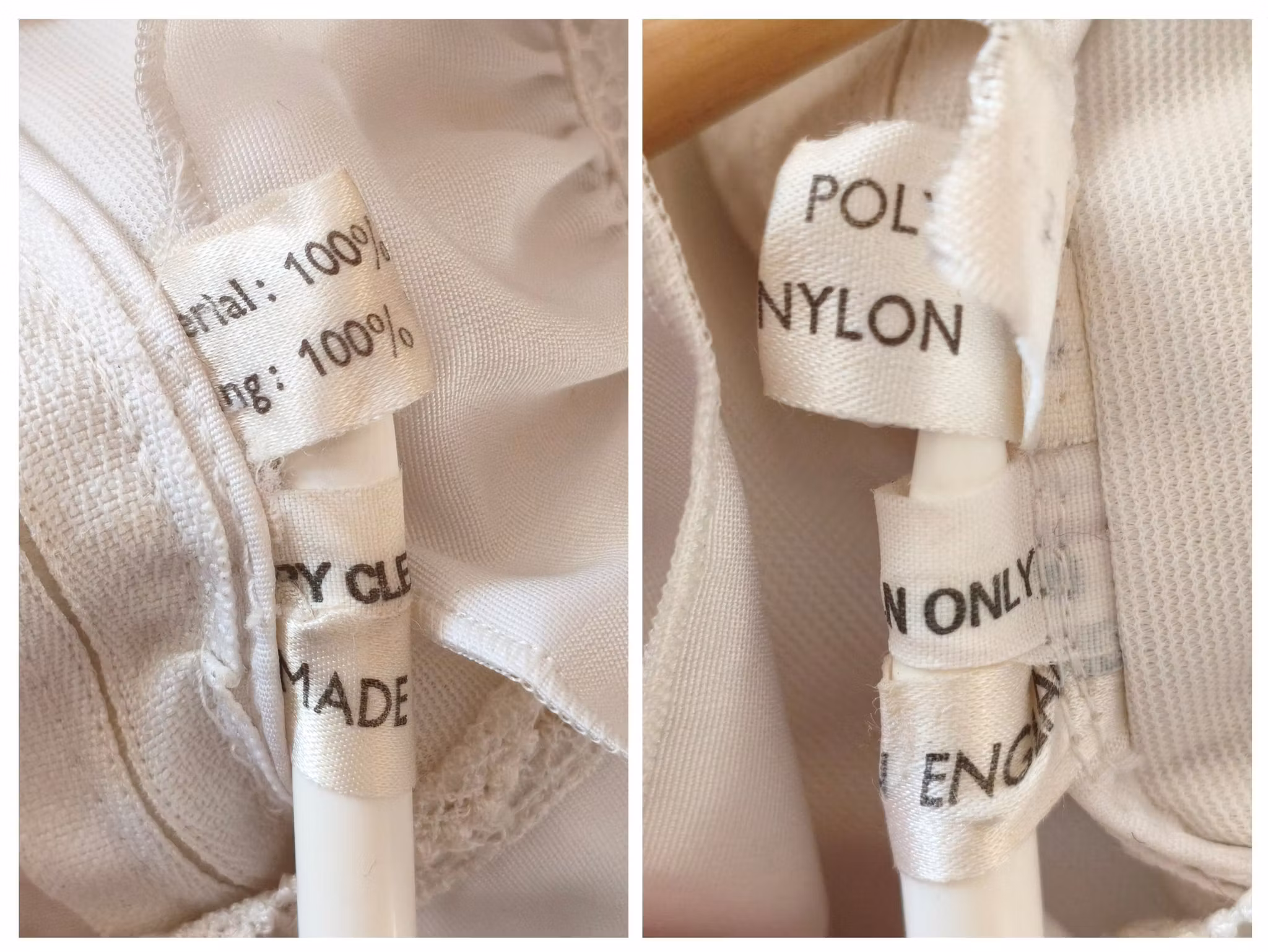 Tillverkad i England, 100% polyester yttre material och 100% nylon innerfoder. Kemtvättas enligt lapp. Uppskattar den till S-M.